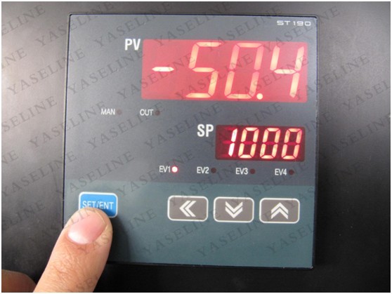 3、打開控制器按“SET/ENT”按鍵,SV顯示值光標(biāo)閃爍,再點擊“上下標(biāo)志圖”,設(shè)定所需溫度,再按“SET/ENT”進行確認(rèn)。